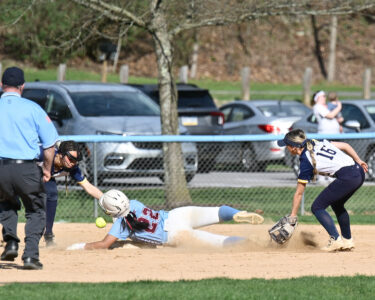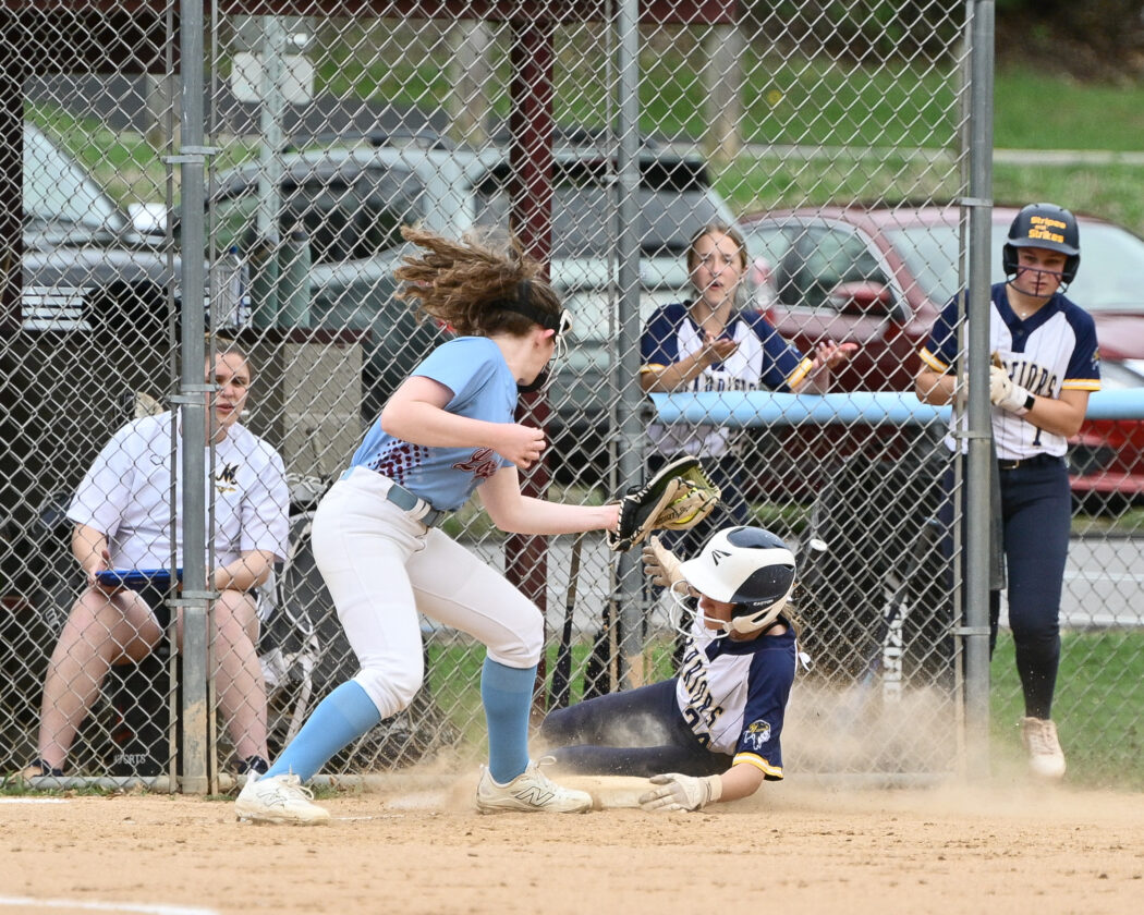 - RALPH WILSON/Sun-Gazette Correspondent Montoursville’s Emily George (24) beats the tag at third during a high school softball game against Loyalsock at Short Park on Tuesday.
