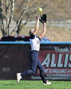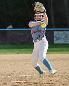- RALPH WILSON/Sun-Gazette Correspondent Montoursville’s Kayleigh Sheleman (4) fields a pop fly during a high school softball game against Montoursville at Short Park on Tuesday.