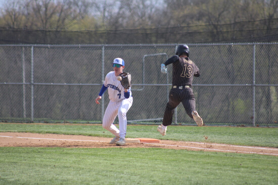 - CJ DOEBLER/Special to the Sun-Gazette Warrior Run’s Logan Stevenson hauls in a throw for an out at first base against Southern Columbia on Monday.