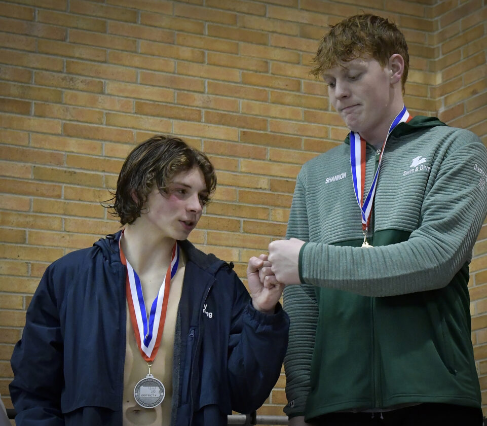 RALPH WILSON/Sun-Gazette Correspondent Muncy’s Logan Diehl, left and Lewisburg’s Colin Shannon bump fists after receiving silver and gold, respectively, in the 500 free at district sthis year. Both Diehl and Shannon earned Sun-Gazette boys swimming all-star honors this year.
