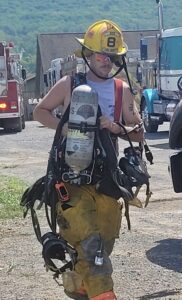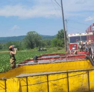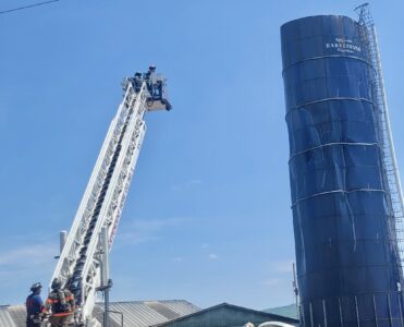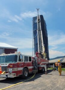 Two aerial ladders were used, one from Jersey Shore and another from Avis, to reach the top of the silo. Shortly after 2 p.m. a firefighter with an air pack who had been working on the top of the extended Avis ladder truck for several minutes was suddenly overcome by heat and could not climb down. A second firefighter immediately went to him as the ladder was quickly lowered to the ground, where additional firefighters rushed to the man’s aid. He was treated at the scene, officials said.