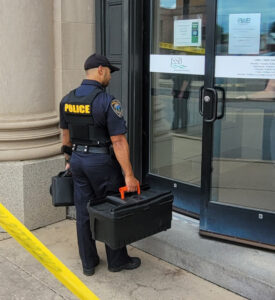 - Police working at bank robbery scene. PHIL HOLMES/Sun-Gazette