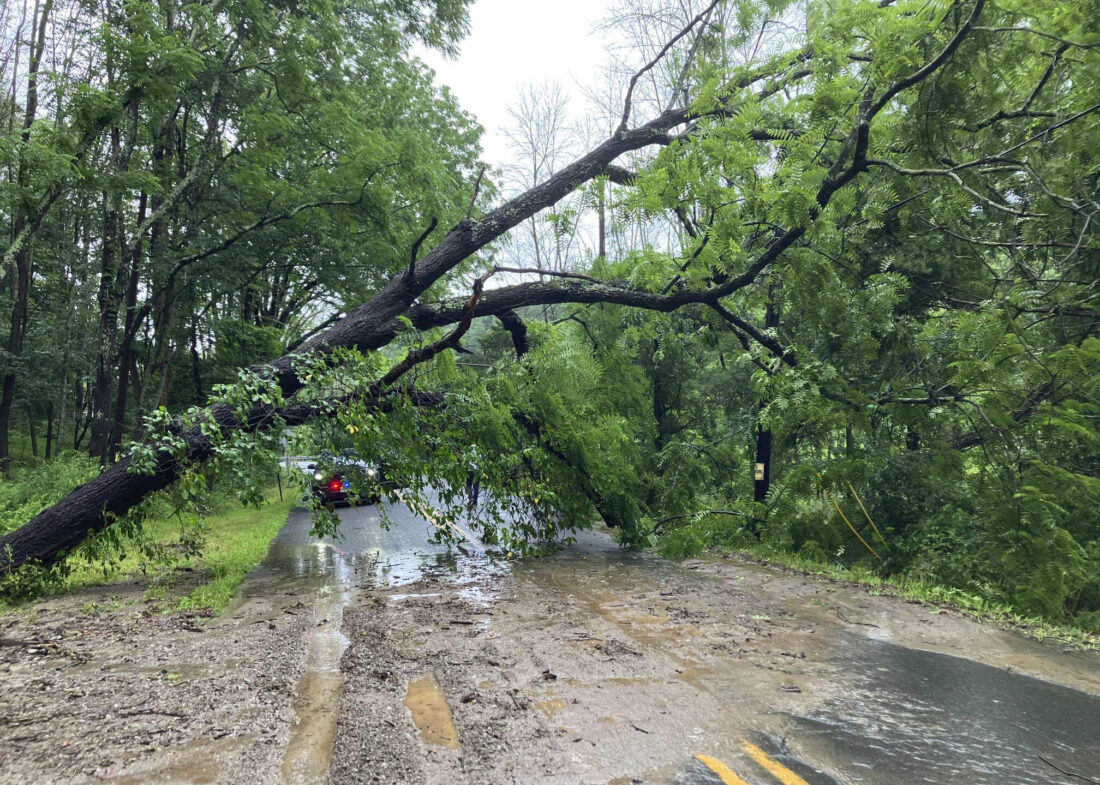 This photo provided by Jersey Central Power & Light shows flooding and a partially fallen tree along Swayze Mill Road, in Hope, N.J., Sunday, July 16, 2023. (Courtesy of JCP&L via AP)