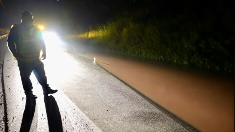 DAVE KENNEDY/Sun-Gazette A PennDOT worker keeps watch on Route 220 during flooding early Monday morning near Picture Rocks.