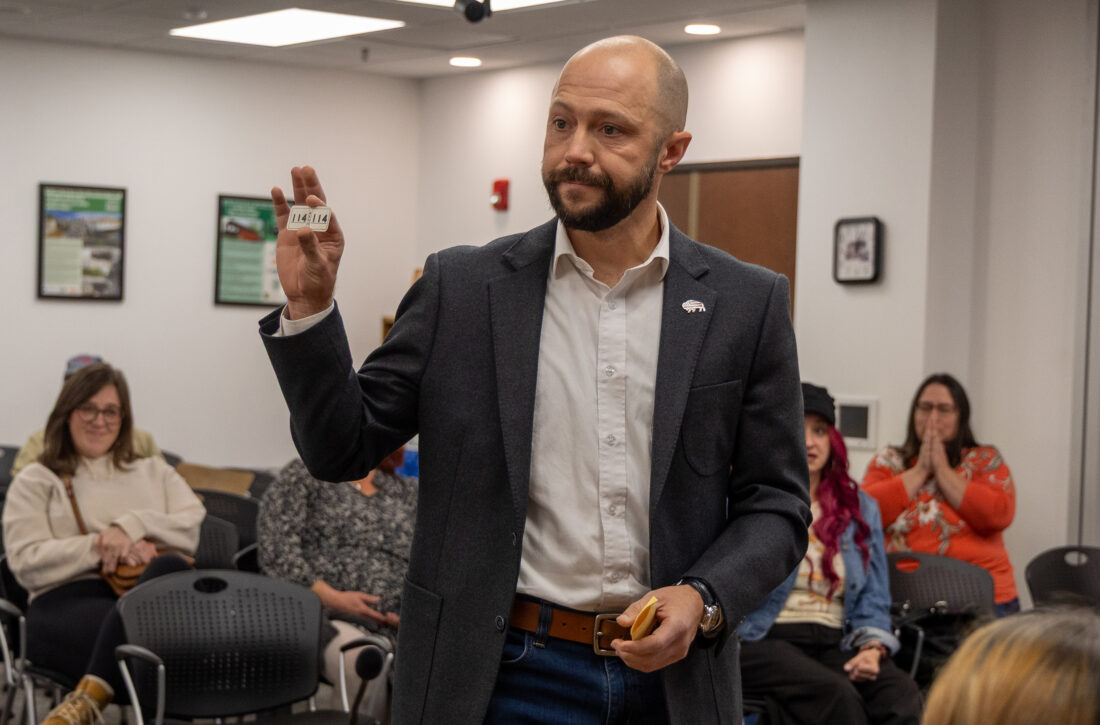 KAREN VIBERT-KENNEDY/Sun-Gazette Eric Beiter, a Republican incumbent on Williamsport City Council, draws the lower number to win the election that was a tie with Democrat April Line, Friday in Williamsport. In the event of a tie the winner of the seat was to be determined with a drawing as dictated by state law.