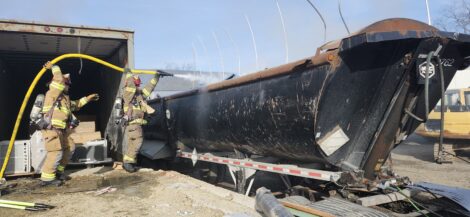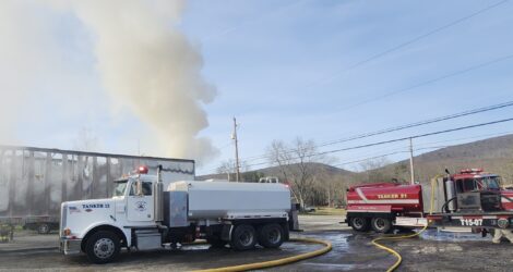 MONTGOMERY – Volunteer firefighters were called to Bryson Truck Repair about 1:30 p.m. Monday when a fire – involving two semi trailers that were next to one another – broke out at the business at 288 Route 54 in Clinton Township.