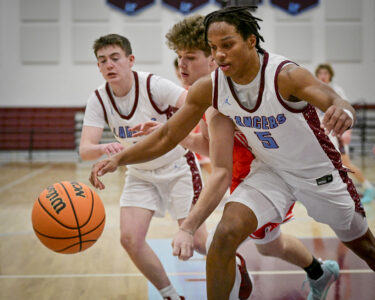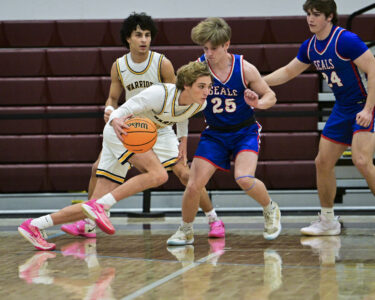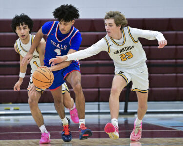 - RALPH WILSON/Sun-Gazette Correspondent Montoursville’s Elijah Eck (25) and tries to steal the ball from Selinsgrove’s Xaivier Jackson (4) during the boys Holiday Classic at Loyalsock on Monday.