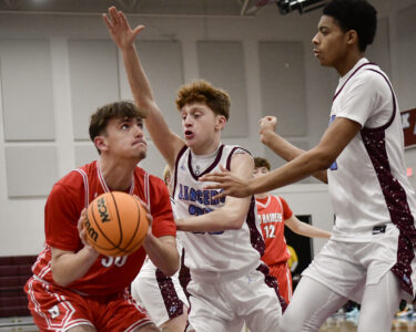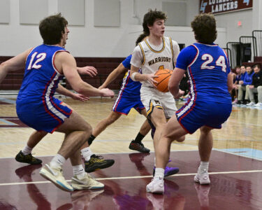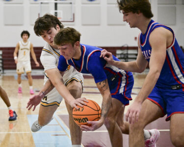 - RALPH WILSON/Sun-Gazette Correspondent Montoursville’s Isaac Erlandson (4) looks to pass around Selinsgrove’s Chase Carter (12) and Jack Piecuch (24) during the boys Holiday Classic at Loyalsock on Monday.