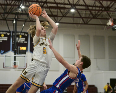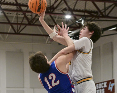 - RALPH WILSON/Sun-Gazette Correspondent Montoursville’s Isaac Erlandson (4) looks to pass over the head of Selinsgrove’s Chase Carter (12) during the boys Holiday Classic at Loyalsock on Monday.