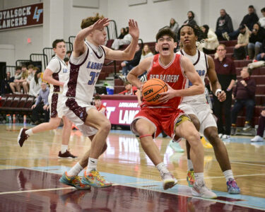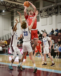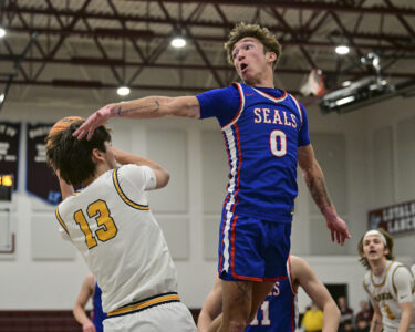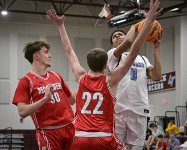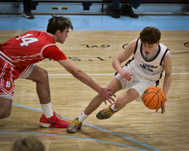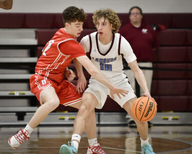 - RALPH WILSON/Sun-Gazette Correspondent Montoursville’s Brennen Imbro (13) looks to pass over the head of Selinsgrove’s Mac Defazio (11) during the boys Holiday Classic at Loyalsock on Monday.