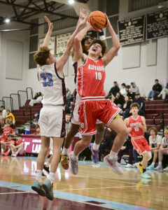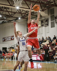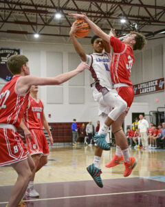 - RALPH WILSON/Sun-Gazette Correspondent Loyalsock’s Jalil Coates (5) heads into the paint past Bellefonte’s John Servant (10) during the boys Holiday Classic at Loyalsock on Monday.