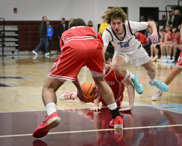 - RALPH WILSON/Sun-Gazette Correspondent Loyalsock’s Brecken Gusick (10) dives for a loose ball during the boys Holiday Classic at Loyalsock on Monday.