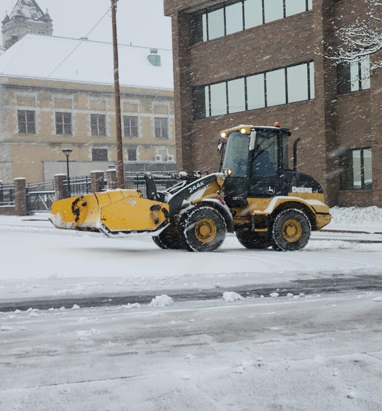 PHILIP A. HOLMES/Sun-Gazette Although winter doesn't start officially until Dec. 21, the region received its first snowfall on Tuesday when steady, but wet snow fell throughout the morning. AccuWeather estimated 2-4 inches were expected to accumulate by the time the snow tapered off by early afternoon. Everything from shovels, battery-powered snow brooms as well as backhoes, like ones shown in these downtown photos, were put into service to clear walks and parking lots. The county's 911 center dispatched more than a half a dozen crashes between 6 and 10:45 a.m , but none resulted in serious injuries, according to officials. Just before 11 a m., a driver suffered minor injuries when her vehicle went off the road and landed in a ditch in the 300 block of Nices Hollow Road in Porter Township. Lycoming Regional police were investigating the accident.