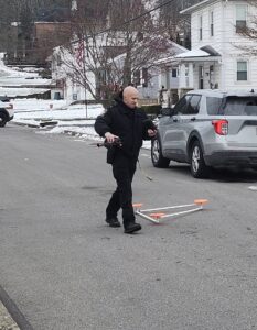 A state trooper assigned to the Reconstruction Unit at the Montoursville barracks prepares to operate a drone at Saturday's fatal shooting scene in South Williamsport. PHILIP HOLMES/Sun-Gazette